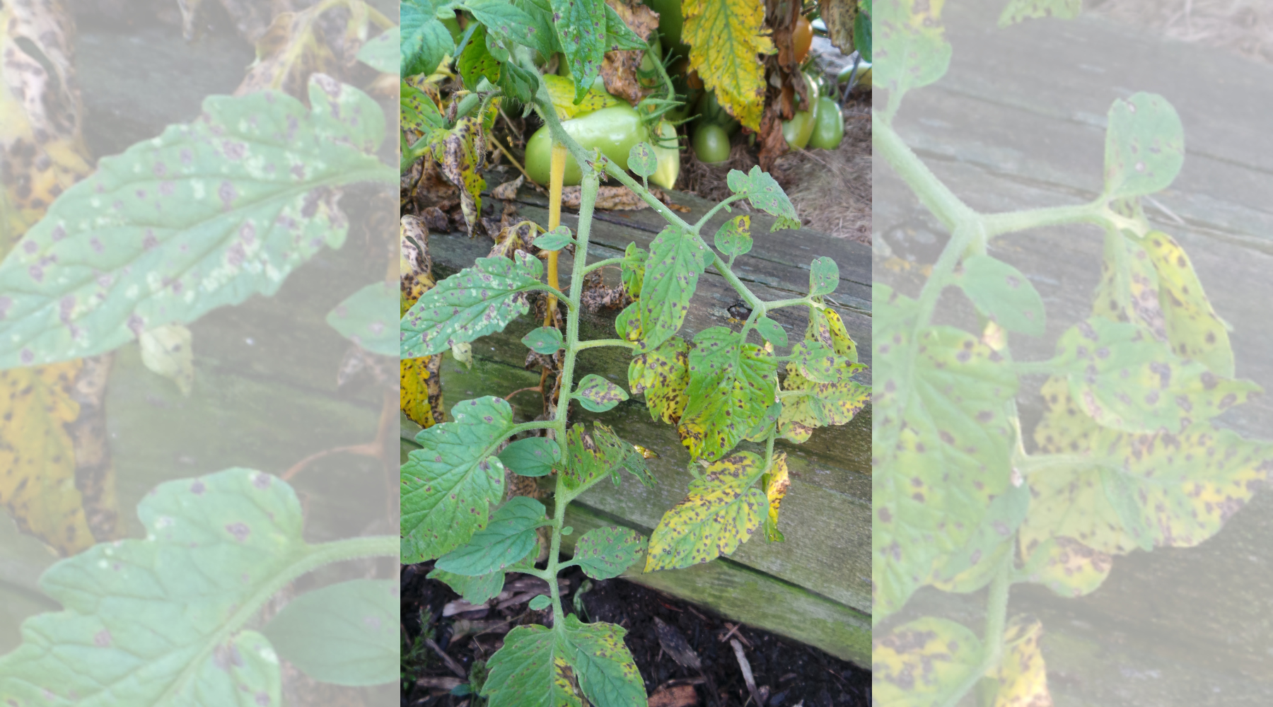 Early blight and septoria leafspot are fungal leaf diseases infecting tomato plants, especially during wet weather. Initial symptoms typically appear on the lower foliage of plants, starting as deep brown or blackish spots, followed by yellowing or browning of leaves. Early blight spots will develop concentric rings and a target-like appearance, often with a yellow halo. Septoria spots typically have whitish centers and dark borders. Both diseases may progress up plants, especially during wet, humid conditions, and even kill entire plants.