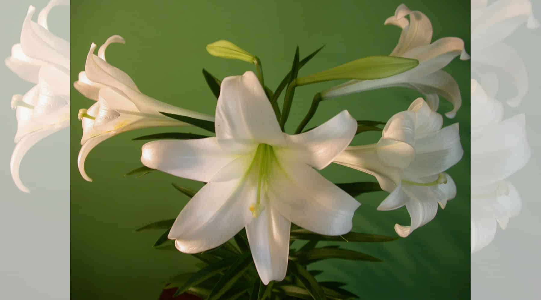 The pure white flared trumpets of Easter lily flowers are a time-honored symbol of the hope, purity, and innocence embodied in the Easter tradition. Lilies grow each year from scaly bulbs deep in the earth, a resurrection if you will, to form majestic plants with sturdy, dense green foliage and radiant white flowers touched with sweet fragrance.